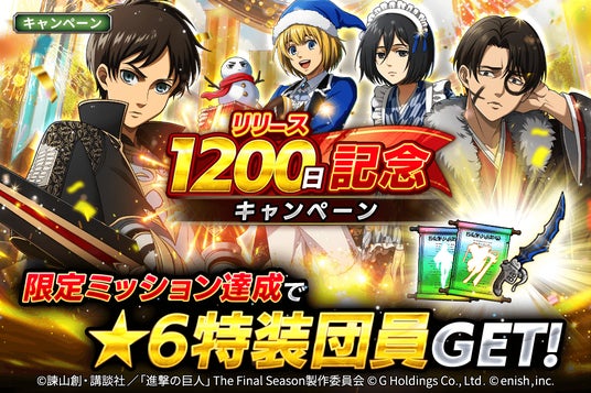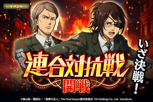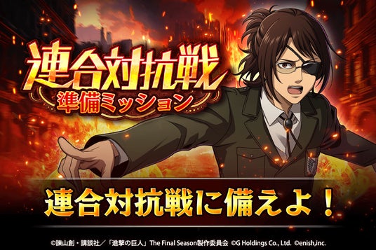 株式会社enish(本社:東京都港区、代表取締役社長:安徳 孝平、以下enish)は、アニメ『進撃の巨人』のスマートフォンゲーム最新作「進撃の巨人Brave Order」にて、2025年5月22日(木)より、「連合対抗戦」のエントリー期間が開始!また、本日より新登場の【調査兵団コート】ハンジ・ゾエ、【調査兵団コート】ジャン・キルシュタインがピックアップされた「連合対抗戦ガチャ」も開催!その他、最新情報はゲーム公式サイト・ゲーム公式X(旧Twitter)アカウントにて随時公開して行きますので、ぜひご覧ください。