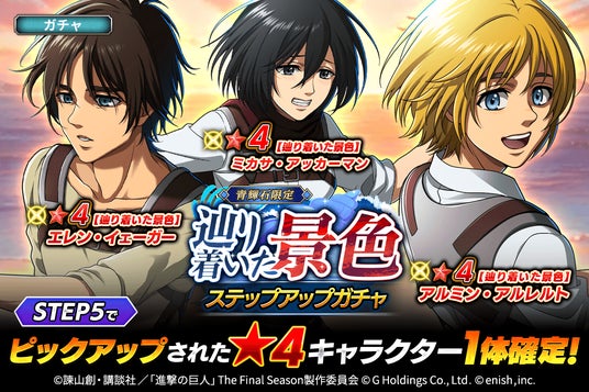 株式会社enish(本社:東京都港区、代表取締役社長:安徳 孝平、以下enish)は、アニメ『進撃の巨人』のスマートフォンゲーム最新作「進撃の巨人Brave Order」にて、2025年6月13日(金)より、「辿り着いた景色」を開催!また、本日より新登場の【辿り着いた景色】アルミン・アルレルト、【辿り着いた景色】ミカサ・アッカーマン、【辿り着いた景色】エレン・イェーガーがピックアップされた「辿り着いた景色ガチャ」も開催!その他、最新情報はゲーム公式サイト・ゲーム公式X(旧Twitter)アカウントにて随時公開して行きますので、ぜひご覧ください。