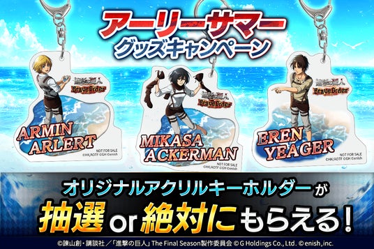 本日、2025年6月13日(金)より辿り着いた景色のアルミン、ミカサ、エレンをモチーフにしたオリジナルアクリルキーホルダーが抽選又は絶対にもらえるアーリーサマーグッズキャンペーンを開催!