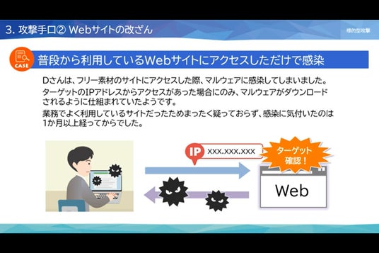 本コースでは、標的型攻撃の代表的な手口やその対策方法を、具体的に分かりやすく紹介しています。