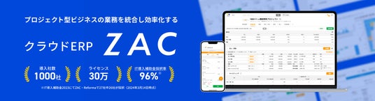 クラウドERP「ZAC」はプロジェクト損益管理、管理会計、内部統制、決算早期化を実現する統合型の基幹業務システムです。業務効率化と的確な経営判断を支援し、企業の継続的な成長を担う経営基盤として、IT業、システム業、広告業・クリエイティブ業、士業、コンサルティング業をはじめとした累計1000社を超える企業様に導入いただいております。モジュール(機能)単位で導入範囲やライセンス数を選択でき、導入後も必要に応じて機能やライセンスの追加が可能であることも特徴です。