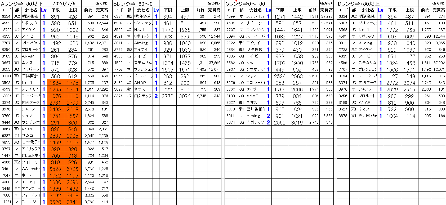 2020/7/9(木曜日) 今日のシステムトレードの仕掛候補一覧です。今日の日経の寄り付きはCレンジでした仕掛表の各レンジは日経平均の前日終値比で以下のよう... ...続きを読む