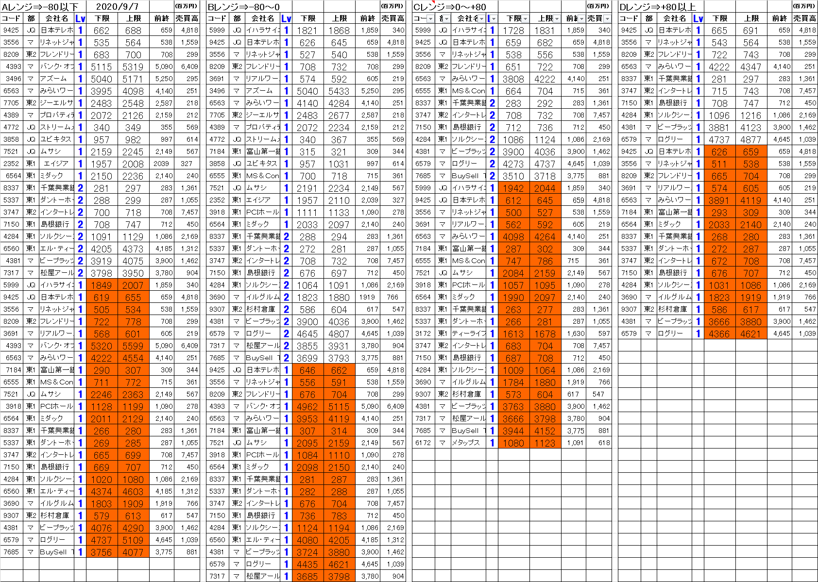 2020/9/7(月曜日) 今日のシステムトレードの仕掛候補一覧です。今日の日経の寄り付きはBレンジでした仕掛表の各レンジは日経平均の前日終値比で以下のよう... ...続きを読む