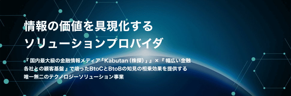 「情報の価値を具現化する仕組みを提供する」という理念のもと、メディア事業・ソリューション事業の両輪で、幅広い情報サービスを推進しています。ソリューション事業では、「株探」を通じて投資家とのコミュニケーションを図り、金融機関向けにソリューションサービスを提供、メディア事業では子会社のライブドアを通じ、クリエイター・ユーザー・クライアントを新たな価値創造で繋ぐエコシステムの構築に取り組んでいます。