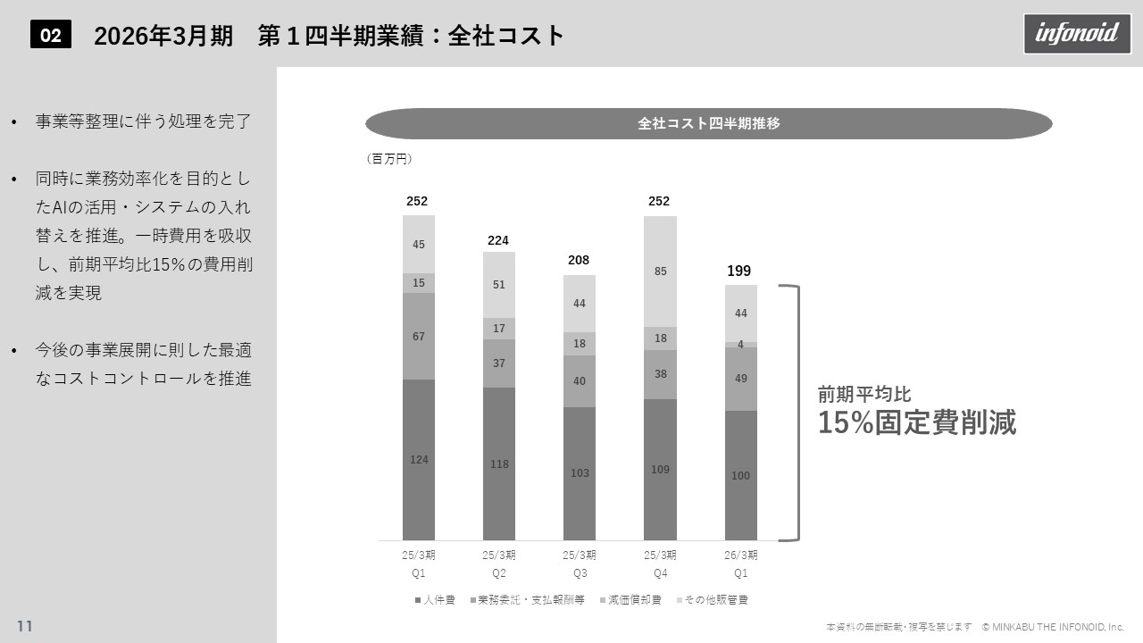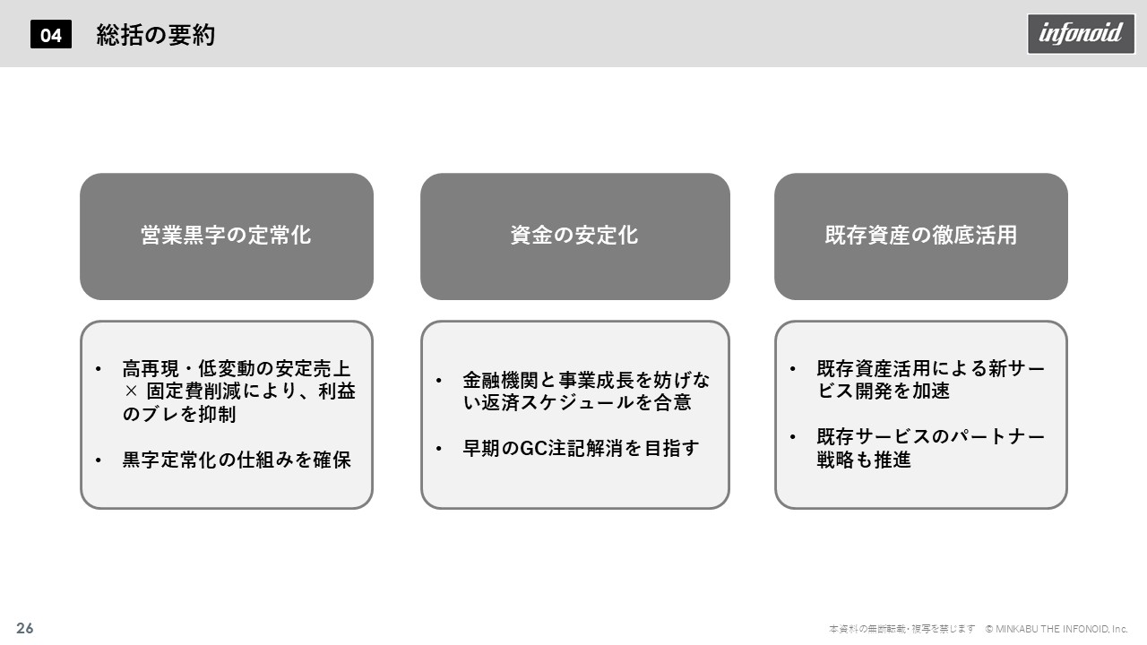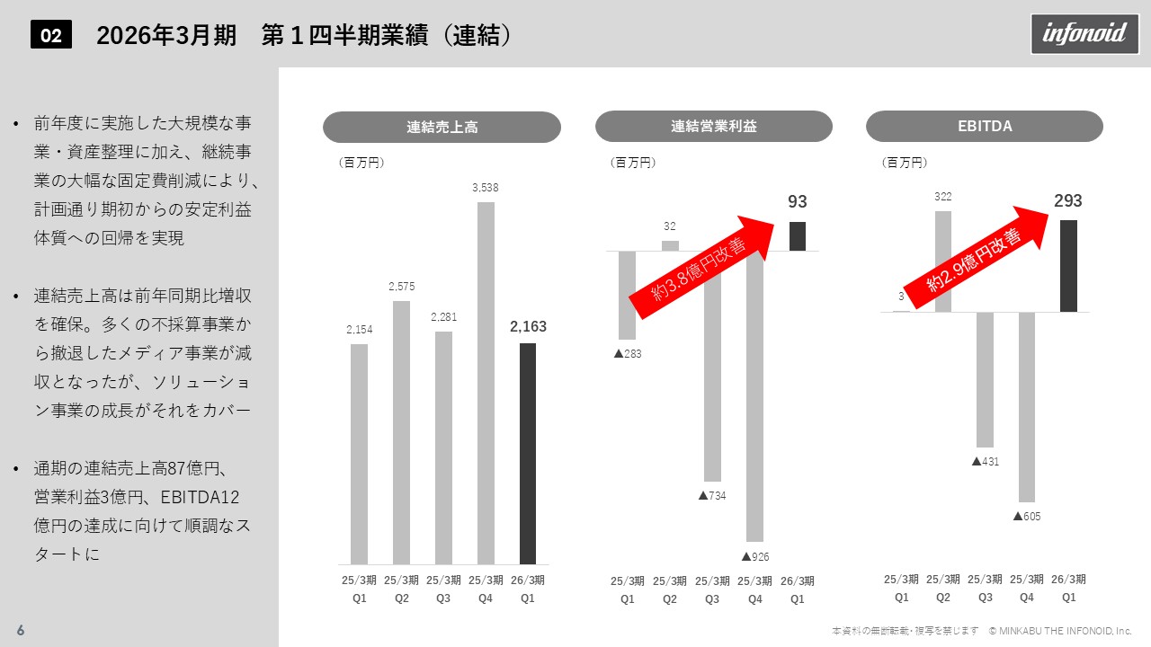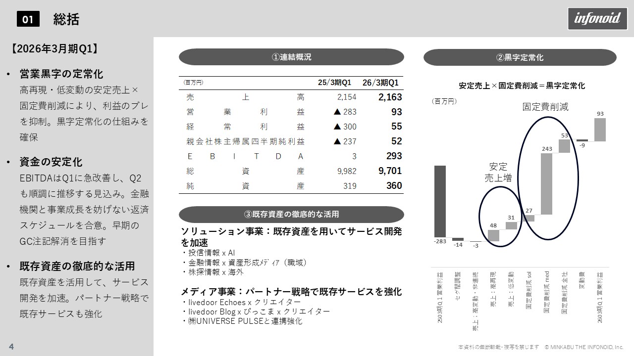 1.サマリ 2026年3月期第1四半期は、前年度の大規模な事業・資産整理と固定費削減効果が顕著に現れ、期初から安定的な利益体質を確立。営業黒字を継続できる構造が定着し、計画通りの滑り出しとなった。固定費抑制と安定売上の両立により利益変動を抑制、EBITDAも急速に改善し、第2四半期以降の順調な推移が見込まれる。金融機関とのリスケジュール合意により、返済負担を軽減しつつ早期のGC注記解消を目指している。 2.業績概況 (1)連結 連結売上高は前年同期比で増収。メディア事業は不採算撤退の影響で一時的に減収も、ソリューション事業の堅調な伸長が全体を牽引。固定費削減効果により営業利益・EBITDAとも大幅改善し、通期目標(売上高87億円、営業利益3億円、EBITDA12億円)に向け極めて順調に推移した。営業利益は前年同期比約3億円増、利益創出体制の定着が明確化している。 (2)ソリューション事業 ソリューション事業では、情報ソリューションとSI・パッケージ両領域でストック収益が拡大し、前年同期比7%増。固定費削減も進み、ストック収益のみで固定費を賄う構造を実現。Kabutanプレミアム値上げ効果も寄与し、利益率が大幅に改善した。安定収益を投資原資とした再投資サイクルが形成されている。 (3)メディア事業 メディア事業は減収ながらも黒字転換。固定費21%削減により安定黒字化を実現。広告依存型からクリエイターズエコノミーやコマースなど非トラフィック型収益へとシフトが進展し、変動リスクの低い収益構造へ移行した。 (4)全社費用及びキャッシュ・フロー 全社的にはAI活用やシステム刷新による効率化で固定費を15%削減。EBITDAは前期▲6億円から+2.9億円へ急回復。納税による一時的資金減少を除けば営業CFはプラスを維持し、キャッシュポジティブを確保。金融機関との条件変更契約(タームローン56.8億円・シンジケート19億円)締結により、成長を阻害しない返済スケジュールと資金留保を両立。自己資本比率も上期末に倍増見通し。 3.通期見通し 通期進捗も好調で、営業利益進捗率は25%超。費用削減が計画を上回り、安定収益と高収益体制が確立。既存資産の活用も進み、成長フェーズへの布石が整った。 4.セグメント別事業トピックス 既存資産活用では、ソリューション事業で「Robot Report AI」による投信レポート自動化、「MINKABUアカデミー」による職域資産形成支援、海外証券向け情報配信などAI・DX・海外展開を推進。メディア事業では、AIニュース生成「livedoor ECHOES」、ブログ漫画課金(ピッコマ連携)、TikTok×UNIVERSE PULSE連携などによりUGCとAIを融合した新収益モデルを展開している。 結果として、黒字定常化・資金安定化・資産活用という3本柱で成長基盤を確立。金融リスク低減と共に、両事業でのパートナー戦略拡大が進んだ。株主優待も「Kabutanプレミアム」無料クーポンに統一し、還元強化とサービス利用促進を両立。 総じて、構造改革の成果により営業黒字を定常化し、EBITDA・財務体質ともに急回復。既存アセットを核に新サービス創出が進み、安定収益体質から次の成長フェーズへ移行している。当社は「情報の価値を具現化する」というミッションのもと、金融・メディア・テクノロジーの融合による持続的な企業価値向上を目指す。