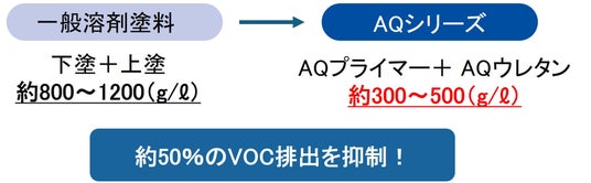 AQプライマーを用いた仕様は、一般的な溶剤塗料の仕様と比較して、おおよそ全体で約50%のVOC排出を抑制可能です。