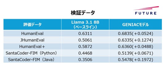 フューチャー株式会社(本社:東京都品川区、代表取締役会長兼社長 グループCEO 金丸恭文、以下フューチャー)は、経済産業省とNEDO(国立研究開発法人 新エネルギー・産業技術総合開発機構)が実施する国内生成AIの開発力強化プロジェクト「GENIAC(Generative AI Accelerator Challenge)」(※1)の支援を受け、2024年10月から「日本語とソフトウェア開発に特化した基盤モデル」の研究開発を行ってきました。この度、本モデルの開発期間が終了し、その成果である基盤モデルを一般公開しました。今後は、評価データセットについても広く公開することで、日本のソフトウェア開発の発展に貢献していきます。