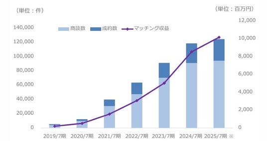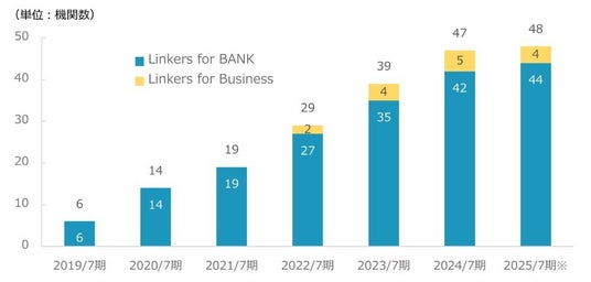 また、「Linkers for BANK」を導入した全地域金融機関や信用金庫における直近3ヶ年の実績は、商談件数及び成約件数は約 200%増、マッチング関連収益は約 450%増(各*6)と大きく伸張するなど、導入した地域金融機関や信用金庫の収益機会の拡大にも寄与しております。