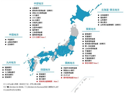 サービス提供開始以降、地域金融機関や信用金庫を中心に全国で 48 機関(*1、*2)に導入されており、そのネットワークは順調に全国に拡大(*1、*3)しております。