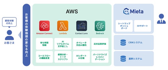 コンタクトセンターシステムはアマゾン ウェブ サービス(以下AWS)が提供するクラウド型コンタクトセンターシステム「Amazon Connect」を採用しています。また、コンタクトセンターの運用における分析・可視化においては、ARIが提供する「Mieta(ミエタ)」を使用し、リアルタイムレポート・ヒストリカルレポートを作成し、全体の指標の管理・可視化を行う予定です。
