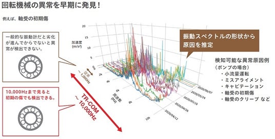 TR-COMを用いて、定期的に自動計測したポンプの振動データを執務室等で確認するとともに、振動データからポンプの劣化兆候が判断できるか検証します。