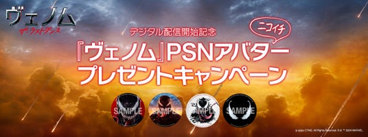 そして、ソニー・インタラクティブエンタテインメントでは、12月18日(水)から2025年1月21日(火)までの期間限定で、PlayStation(R)5、PlayStation(R)4向けエンタテインメントアプリ「SONY PICTURES CORE」を入手したユーザーのみなさまを対象に「映画『ヴェノム:ザ・ラストダンス』デジタル配信開始記念『ヴェノム』PSNアバタープレゼントキャンペーン」を開催!