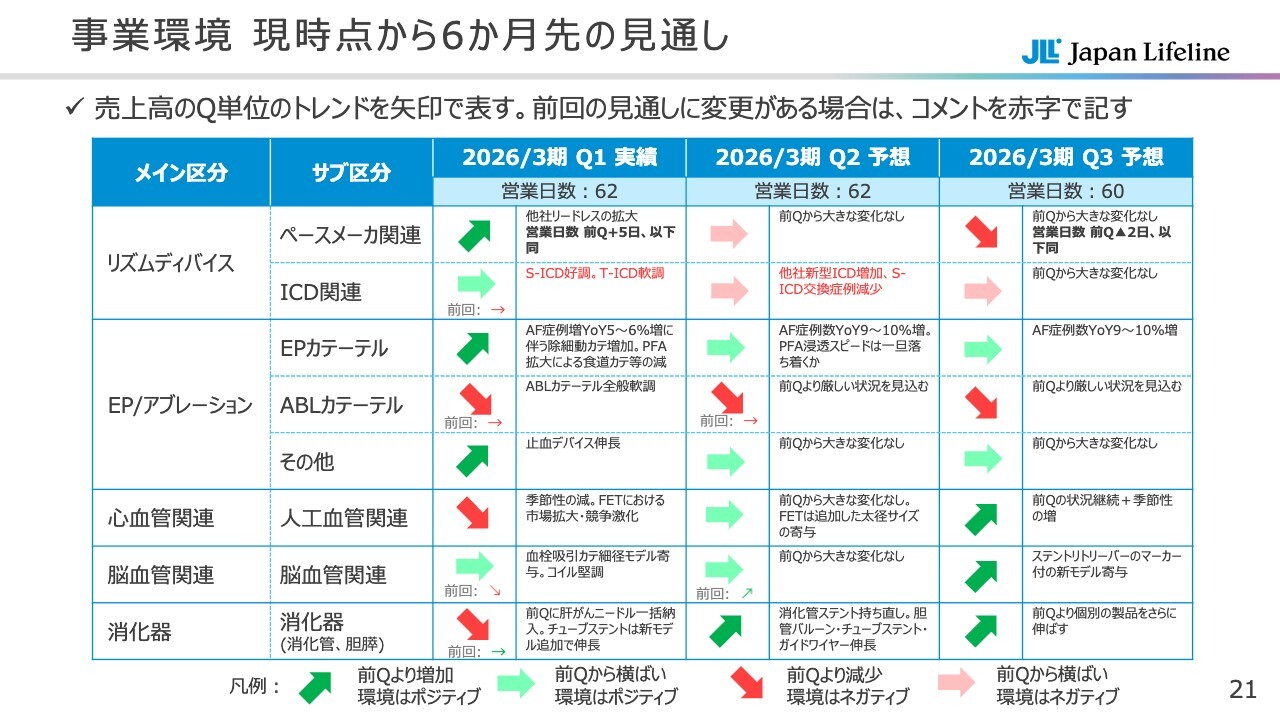 伊藤:前回はICD関連が環境としてネガティブという評価でしたが、今回は緑色の矢印に変更しています。この緑色の前提は、前期から横ばい、つまり環境を保持するというものです。