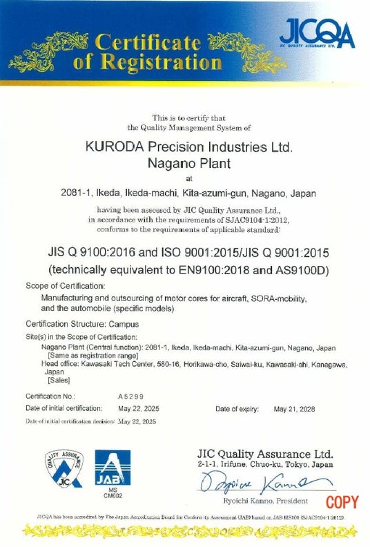黒田精工株式会社(代表取締役社長:黒田 浩史、本社:神奈川県川崎市)は、このたび航空宇宙分野における品質マネジメントシステムの規格を取得しました。当社金型事業部(長野工場)において取得したのは、「JIS Q 9100:航空宇宙・防衛産業品質マネジメントシステム規格」で、IAQG-OASISデータベース※へ登録されました。