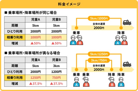 相乗りが成立した場合、送迎利用料のタクシーメーター運賃とシステム利用料300円が、それぞれの乗車距離によって送迎利用料を按分される仕組みが実装されています。それによって1人乗りの場合に比べて送迎利用料を抑えることができます。