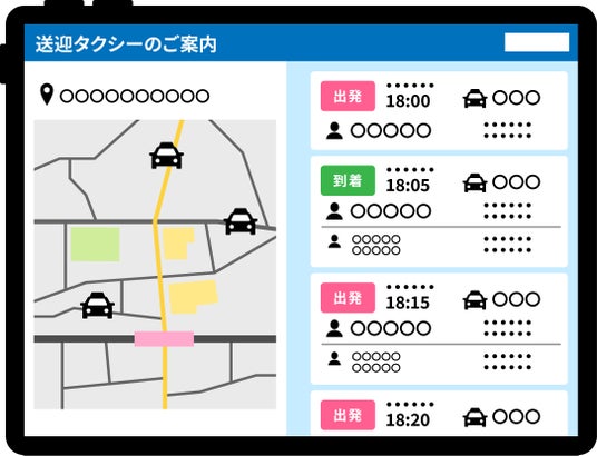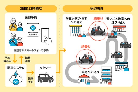 また、学童クラブや習い事教室にとっては、本サービスに加盟することで、自前で送迎バスなどを用意することなく、会員向けのタクシー利用サービスの導入が可能となります。