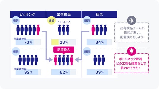 入荷から出荷までの作業進捗をリアルタイムで可視化し、効率的な人員配置や迅速な対応を実現します。作業者一人ひとりのスキルや稼働状況もデータ管理できます。