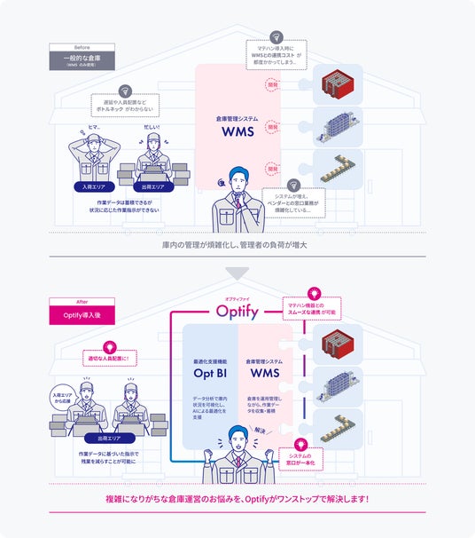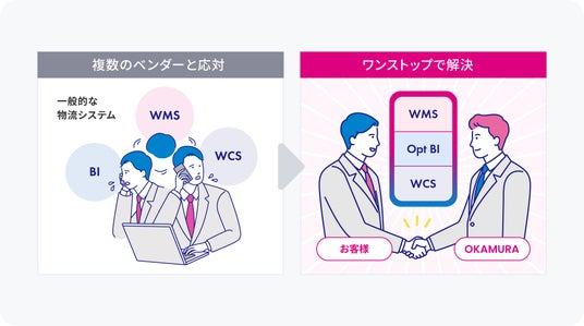 「Optify」は、これまでオカムラが主に提供してきたマテハン機器・マテハン機器制御システム(WCS)との連携に加え、WMSとBI機能をワンストップで提供することが可能です。WMSとマテハン機器・WCSをスムーズに連携することが可能なため、マテハン機器導入時の複雑な調整作業や連携にかかる開発期間・コストを削減できます。また、BI機能「Opt BI」のデータに基づく庫内作業の可視化・予測により、オペレーション最適化のための意思決定や現場改善をサポートします。さらに、システム・機器導入から保守までの窓口を一本化することで、ワンストップでトータルサポートが可能になります。