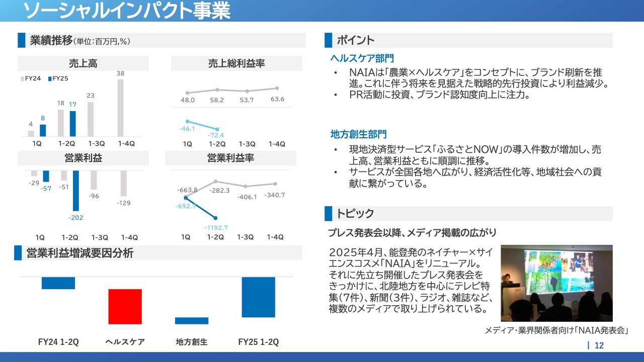 ヘルスケア部門では、「農業×ヘルスケア」というコンセプトのもと、「NAIA(ナイア)」ブランドの刷新を行いました。これに伴う先行投資により利益が減少しています。また、PR活動にも投資を行い、ブランド認知度向上に注力しています。