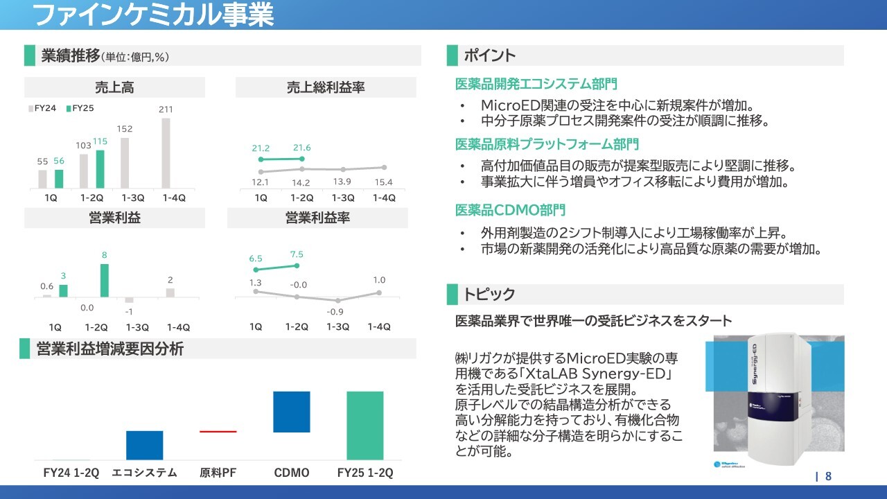 岩城慶太郎氏(以下、岩城):ファインケミカル事業担当の岩城です。まず、ファインケミカル事業についてですが、過去から高収益製品としての地位を築いていた製品が、今回非常に好調だったことがあります。新規に展開した製品として、スライドに記載している「MicroED」は非常にご好評をいただいています。