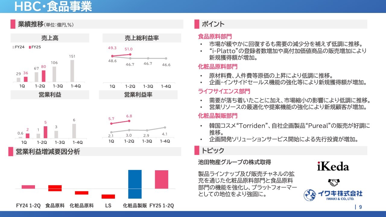トピックとしては、すでに開示していますが、HBC・食品事業においてイワキ株式会社がM&Aを実施しました。スライドに記載のとおり、池田物産グループは主に化粧品原料をグローバルに販売しているグループです。