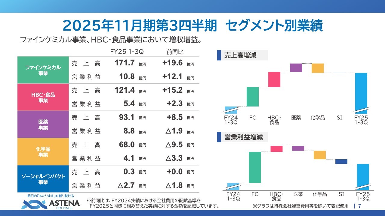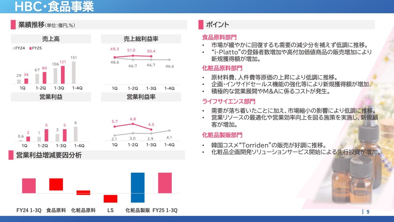 2025年11月期第3四半期の実績は、売上高454億7,000万円、営業利益28億円となりました。売上高は前年同期比8.1パーセント増、営業利益は前年同期比40.1パーセント増となり、増収増益を達成しました。主な要因は、ファインケミカル事業における開発受託の好調と、HBC・食品事業における輸入化粧品販売の好調によるものです。