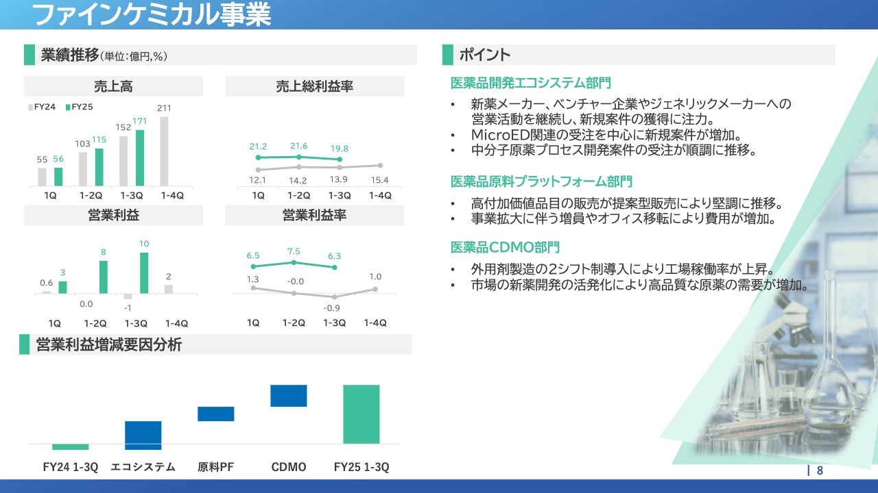 各セグメントの詳細についてご説明します。ファインケミカル事業は増収増益となりました。