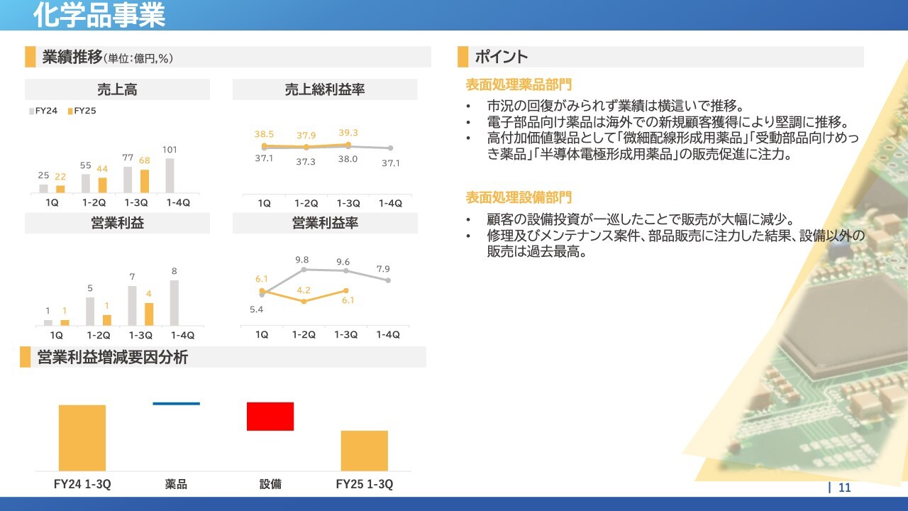化学品事業は売上高68億円で前年同期比9億5,000万円減、営業利益は4億1,000万円で3億3,000万円減少しています。
