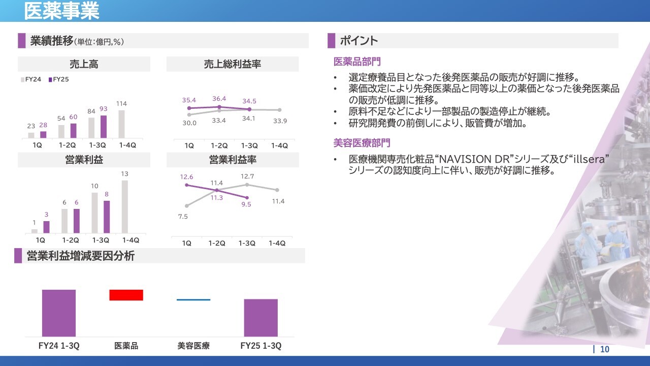 医薬品部門では、選定療養品目となった後発医薬品の販売が好調に推移しました。一方で、薬価改定により一部後発医薬品が先発品と同等以上の薬価となったため、販売は低調に推移しました。また、原料不足による一部製品の製造停止が継続し、研究開発費の前倒しにより販管費が増加しました。