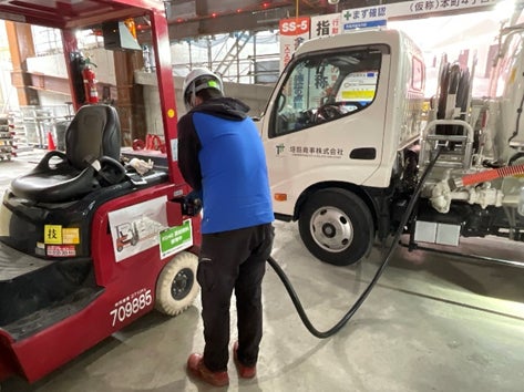 大成建設では、施工時のCO2排出量実質ゼロを目指す「ゼロカーボン・コンストラクション」※4に取り組んでおり、様々な軽油代替燃料の導入を進めています。今回導入した「RD40」は、法律上、軽油と同様に取り扱うことが認められており、「RD40」を給油した車両は、都道府県知事への事前申請や譲渡証※5の携行などの特別な手続なしで公道を走行することが可能です。また、軽油と混ぜて使うことができるため、建設現場間の移動や給油拠点の制限などがなく、適用範囲の大幅な拡大が期待されています。さらに、「RD40」は排ガス中のNOx(窒素酸化物)、PM(浮遊粒子物質)も軽油より少なく、施工中の作業環境や周辺環境への影響を軽減する効果もあります。