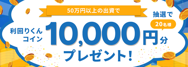 本ファンドに50万円以上のご出資をいただいた方から、抽選で20名様に利回りくんコイン10,000円分を進呈いたします。