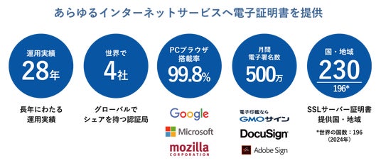 グローバルでシェアを持つ世界トップ4社(※2)の中で唯一の国産認証局「GlobalSign」を保有しており、国内外の主要な電子契約・署名ベンダーへ認証技術を提供しています。また自社開発で導入企業数350万社以上(※3)の「電子印鑑GMOサイン」との連携により、コストパフォーマンスの高いセキュアなサービスを多くの自治体・企業様等にご利用いただいております。