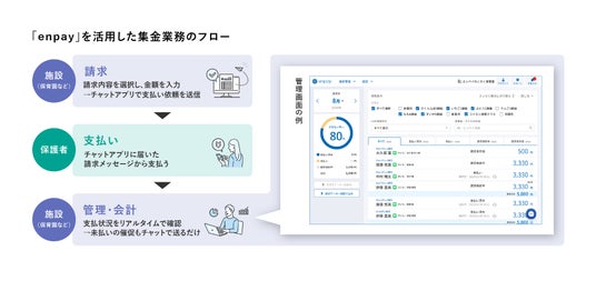 保育・教育業界は、従来現金集金が主流となっており、パソコン利用業務も少ないことから、いまだ現金でのやりとりが多く存在しています。集金前後には金額の周知・領収書の発行・未払いの保護者への催促など多岐にわたる事務作業が施設側に発生し、保護者側も現金を用意する手間があります。このような課題に対しエンペイは、チャットアプリなどデジタル時代のニーズを取り込みながら、請求から決済、入金消込管理までをワンストップで解決するソリューションを提供しています。