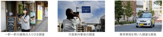 ゼンリンは、国内カーナビゲーション用の地図データでトップシェアを持ち、独自調査から収集・整備した地図データをナビメーカー等に提供しています。全国に約70か所の調査拠点を保有し、建物の入り口情報や方面案内看板、道路規制情報など、カーナビゲーション機能の向上に貢献する詳細な情報を整備・提供しています。