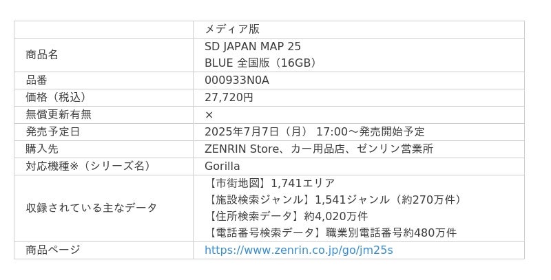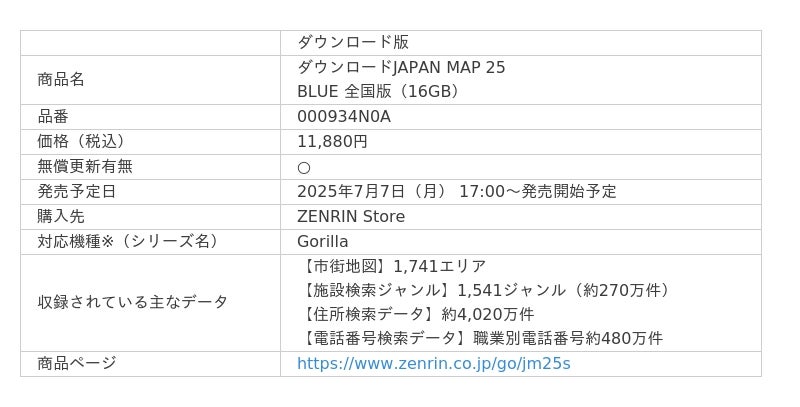 株式会社ゼンリン(本社:福岡県北九州市、代表取締役社長:竹川道郎、以下ゼンリン)は、パナソニックのカーナビ「Gorilla」向け更新地図の2025年度版「JAPAN MAP 25」の販売を、2025年7月7日(月)より開始します。道路データを2か月ごとに無償で更新できるダウンロード版(更新可能期間:2026年6月30日まで/「ZENRIN Store」のみでの販売)と、SDカードに最新の地図情報を収録したメディア版(「ZENRIN Store」、カー用品店、ゼンリン営業所での販売)の2種類での販売となります。