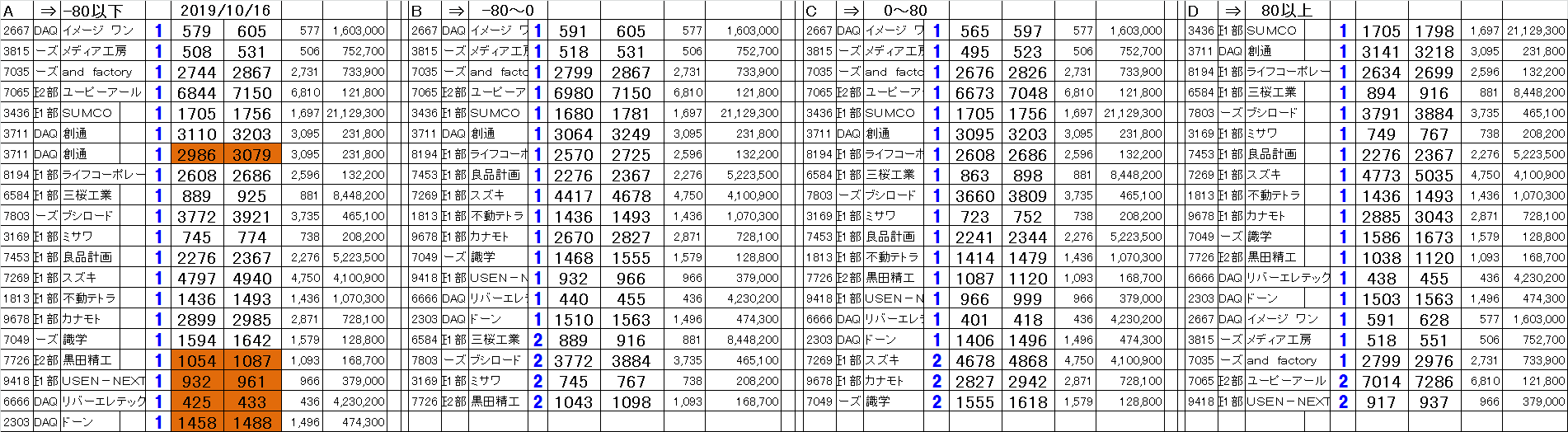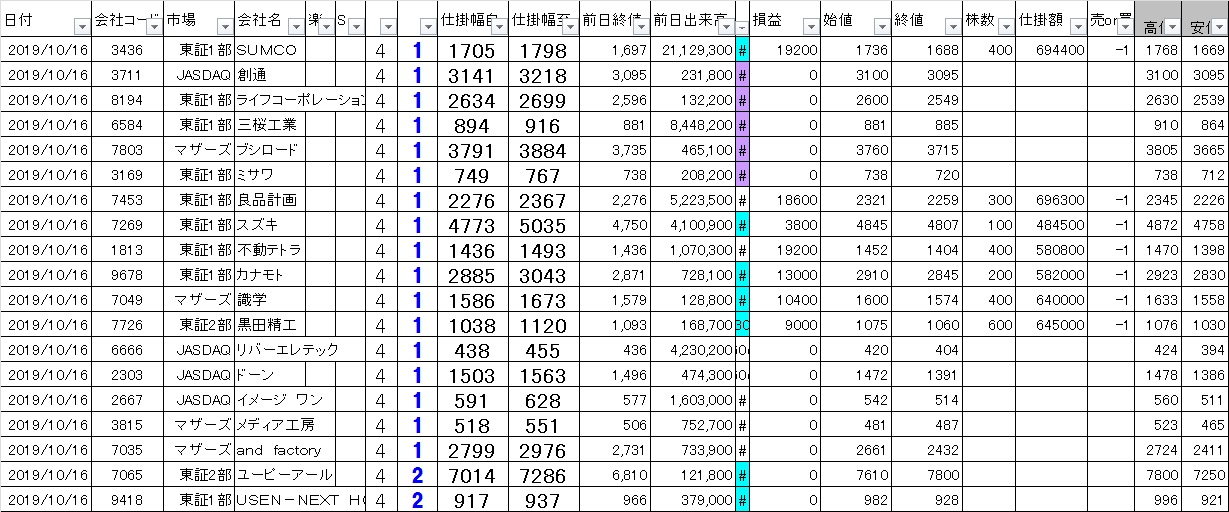 10/16 水曜日 今日のシステムトレードの仕掛候補一覧です。 今日の日経の寄り付きも大幅高でDレンジの仕掛けとなりました。 仕掛表の各レンジは前日終値比... ...続きを読む