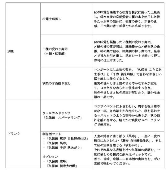 別皿では、香り高い松茸と才巻、三つ葉を取り合わせた「松茸土瓶蒸し」をはじめ、〆鯖の柿の葉寿司と紅葉鯛の押し寿司の二種を味わう「変わり寿司」、コンポートにした梨と「久保田 こうじあまざけ」、「久保田 千寿 純米吟醸」を合わせた「秋梨の甘酒摺り流し」もお楽しみいただけます。
