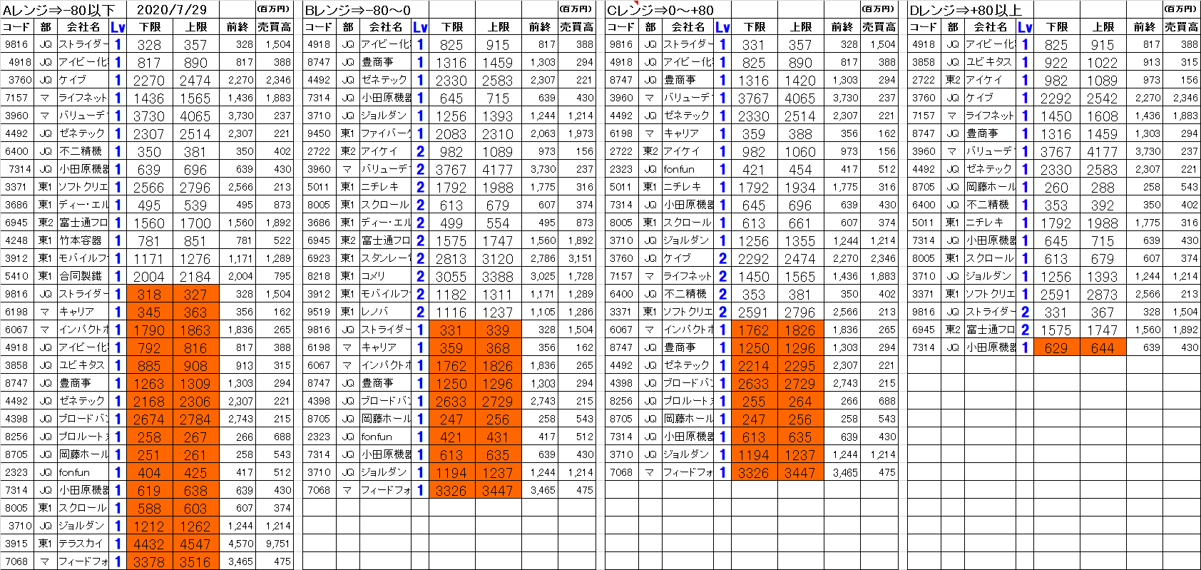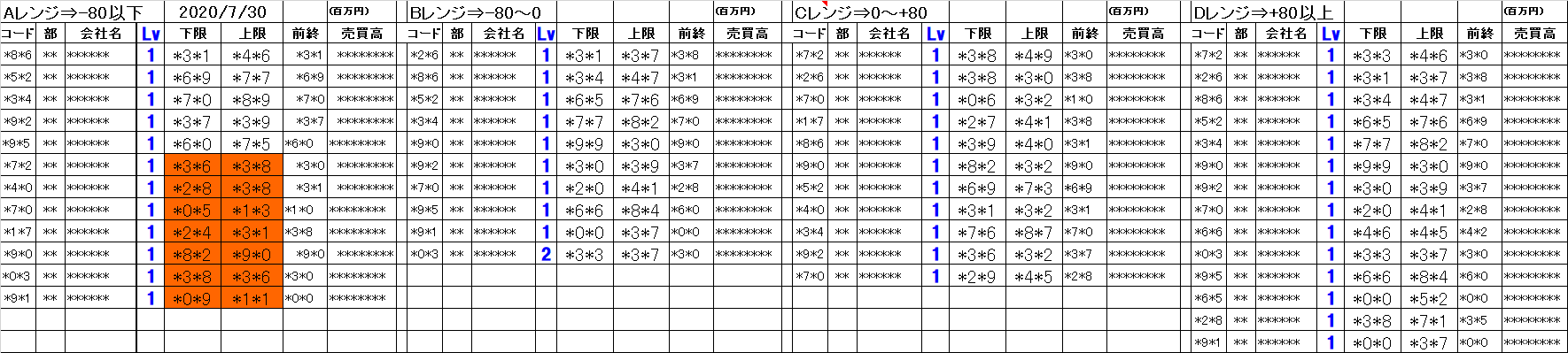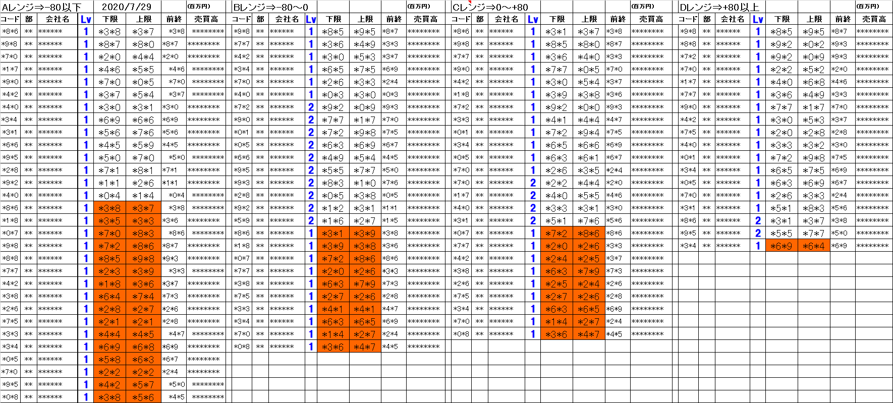 2020/7/29(水曜日) 今日のシステムトレードの仕掛候補一覧です。今日の日経の寄り付きはいくらでしたでしょうか?仕掛表の各レンジは日経平均の前日終値比... ...続きを読む