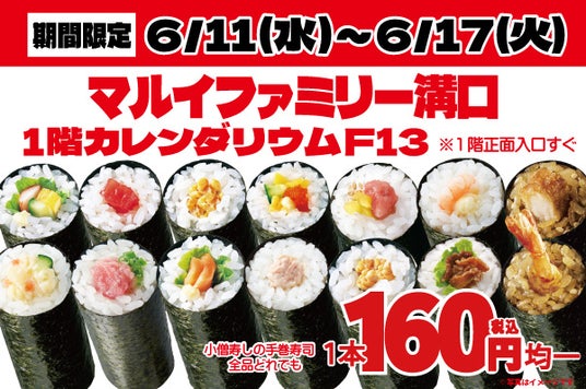 【小僧寿し】マルイファミリー溝口にて期間限定出店します!小僧寿し人気メニュー「手巻寿し」14種類を【特別価格】160円均一!(税込)で販売します!